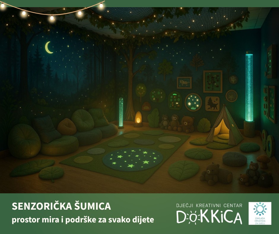 Sažetak projekta: Projekt Senzorička šumica doprinosi unaprjeđenju kvalitete života djece kroz uređenje i opremanje multisenzornog prostora po Snoezelen principu, namijenjenog poticanju senzorne integracije, emocionalne regulacije i osjećaja sigurnosti kod djece. Projekt je usmjeren na djecu s teškoćama u razvoju, djecu u riziku i djecu s povećanom emocionalnom osjetljivošću, ali i na djecu urednog razvoja koja imaju potrebu za smirujućim i strukturiranim okruženjem. U okviru projekta provodit će se aktivnosti uređenja i opremanja prostora, njegovo predstavljanje javnosti te svakodnevno korištenje prostora u sklopu stručnih programa DOKKICE. U suradnji sa stručnjacima različitih profila, projekt će omogućiti djeci da u sigurnom i poticajnom okruženju razvijaju osjetilne, emocionalne i socijalne vještine te smanjuju stres i napetost. Projekt dugoročno doprinosi razvoju inkluzivne i senzibilizirane zajednice koja prepoznaje važnost rane podrške i mentalnog zdravlja djece.